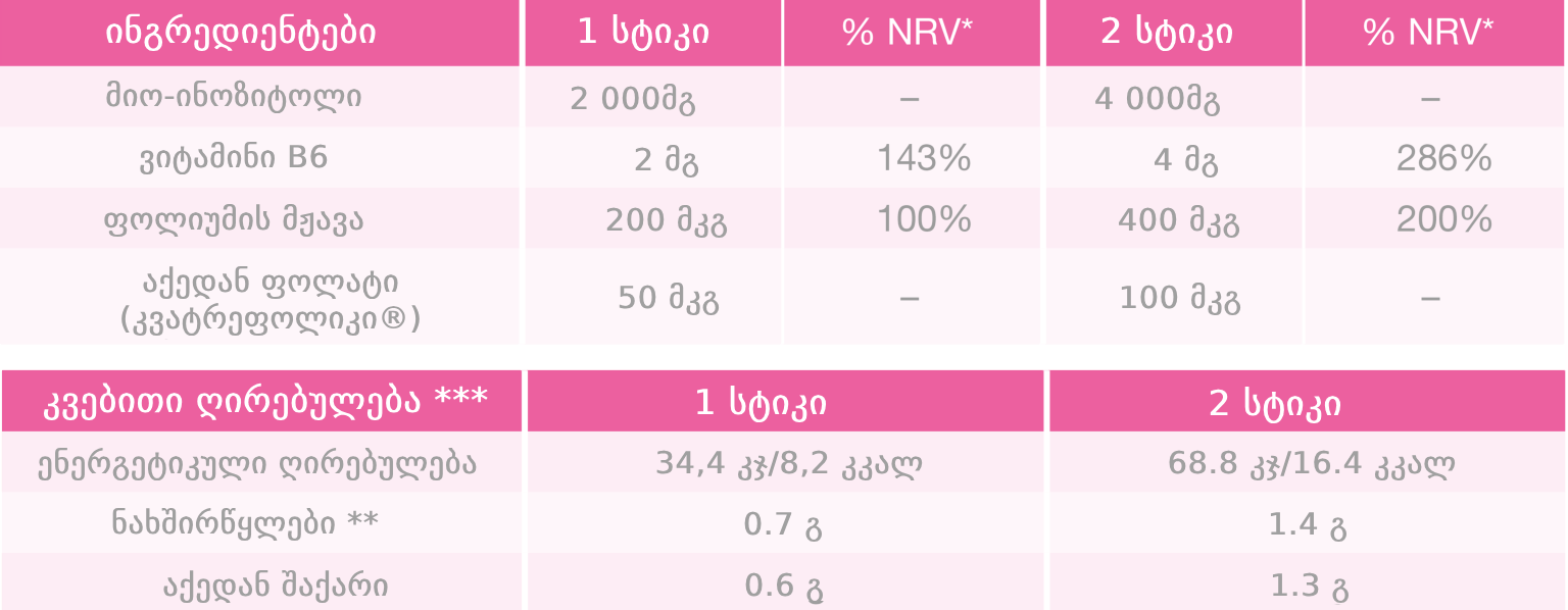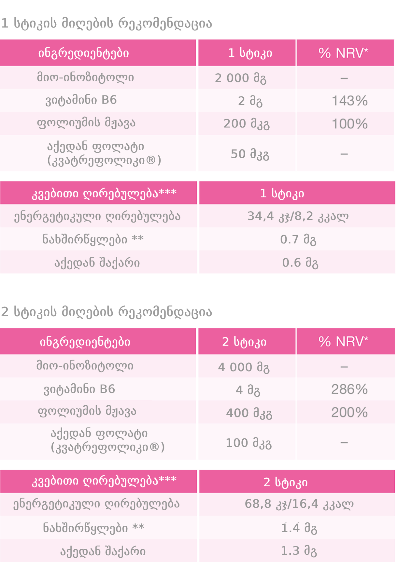 საჭირო შედეგის წინაპირობაა რეგულარული მიღება. აქამდე ინოზიტოლის პროდუქტები პაკეტებში იყო და უნდა გახსნილიყო ჭიქა წყალში. ეს რთულია და მისი მიღების დავიწყება ადვილია – განსაკუთრებით მოგზაურობისას. პროფერტილი® ინოზიტოლი ამ პრობლემას ადვილად ჭრის. მოსახერხებელი სტიკების ჯიბით ტარება მარტივია, ადვილად იხსნება და შესაძლებელია დაუყოვნებლივ მიღება, კენკრის გემო კი დამატებითი სტიმულია რეგულარული მიღებისათვის.